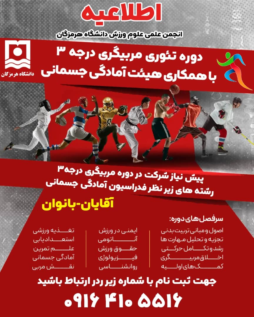 انجمن علمی علوم ورزشی دانشگاه هرمزگان با همکاری هیئت آمادگی جسمانی برگزار می‌نماید: