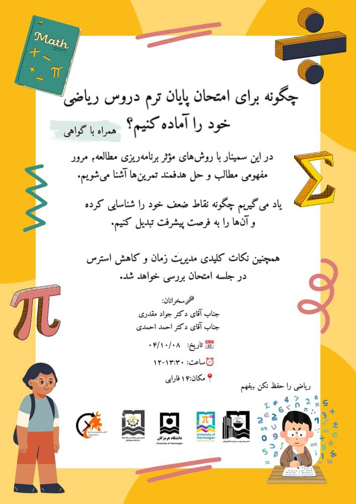 انجمن علمی ریاضی با همکاری انجمن‌های علمی مکانیک، مدیریت صنعتی و صنایع دانشگاه هرمزگان برگزار می‌نماید:
