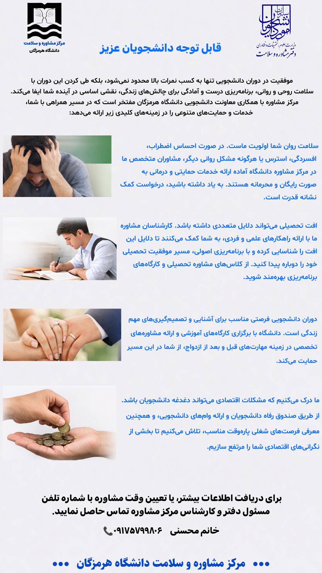مرکز مشاوره و سلامت با همکاری معاونت دانشجویی دانشگاه هرمزگان مفتخر است که در مسیر همراهی با شماست
