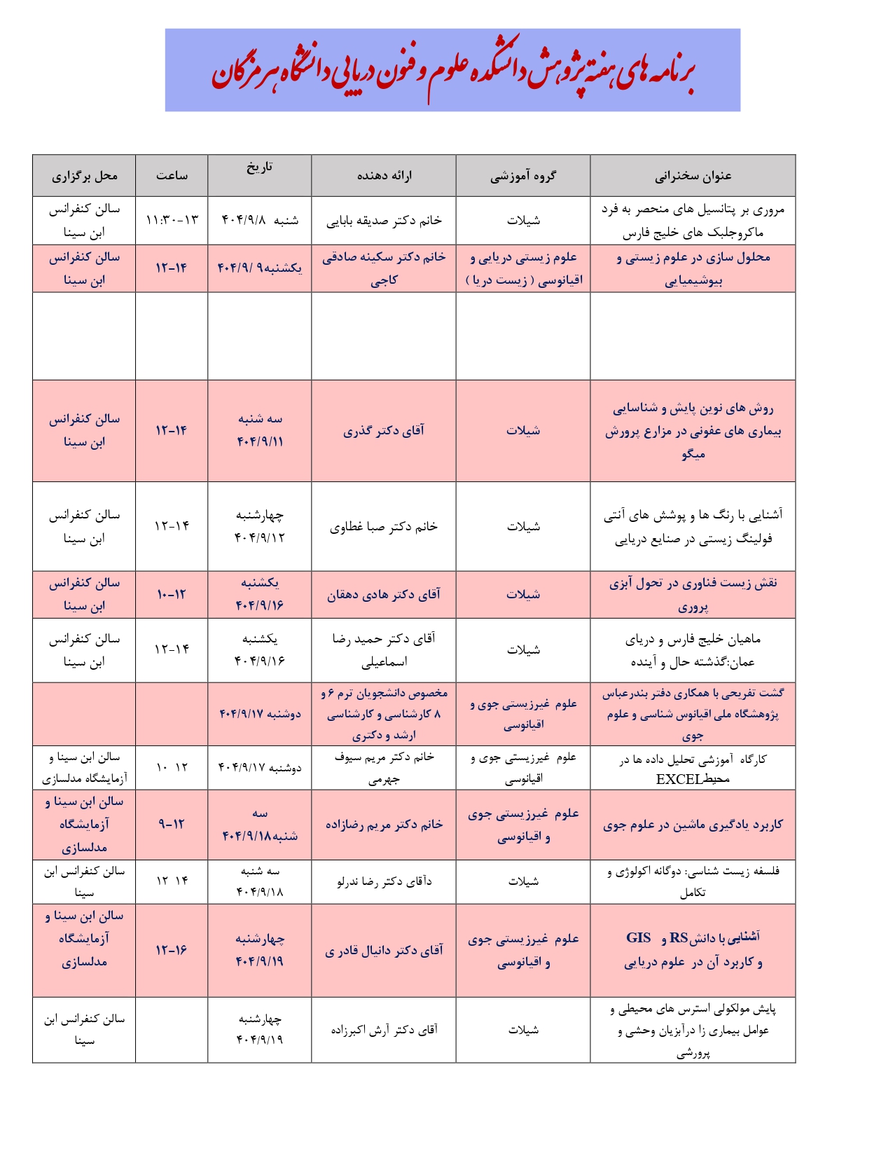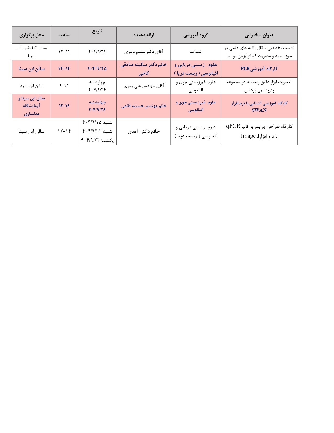 لیست کارگاه های هفته پژوهش دانشکده علوم و فنون دریایی
